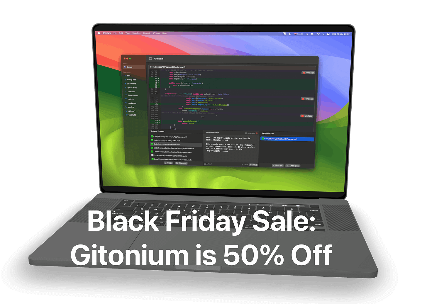 I just wanted to let you know that Gitonium is now available at a 50% discount on the Mac App Store. Get your copy for Black Friday or Cyber Monday. The fine folks atΒ GitKraken called itΒ aΒ must-have tool for developers. π
