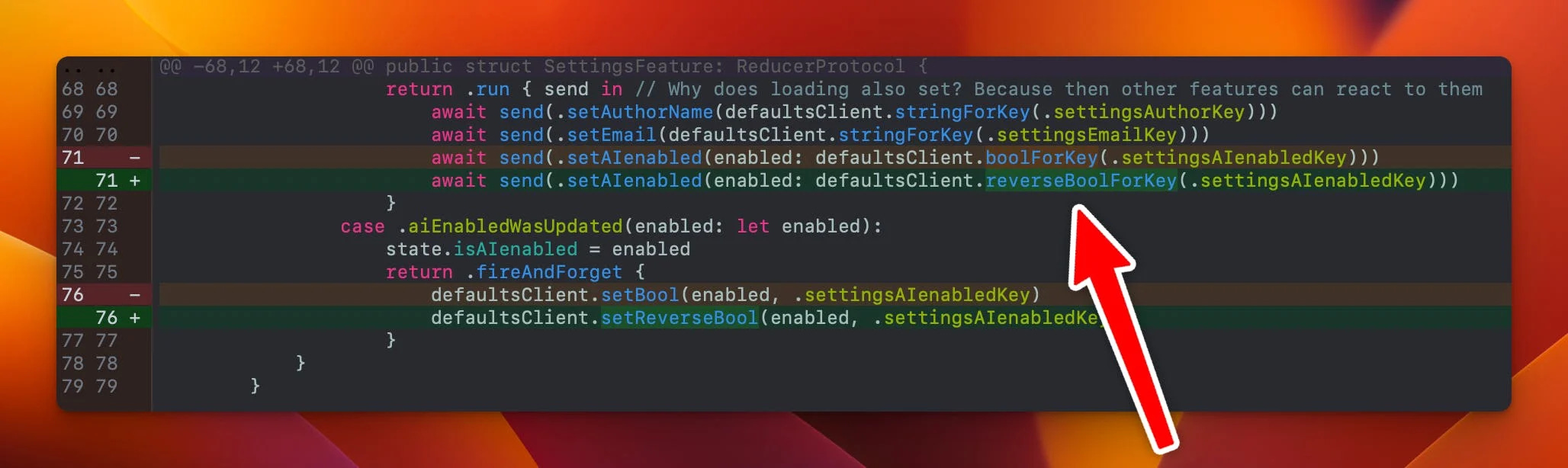 The first feature is to highlight the actual differences internally in a diff. If you need clarification on what I mean, let me illustrate with a screenshot: