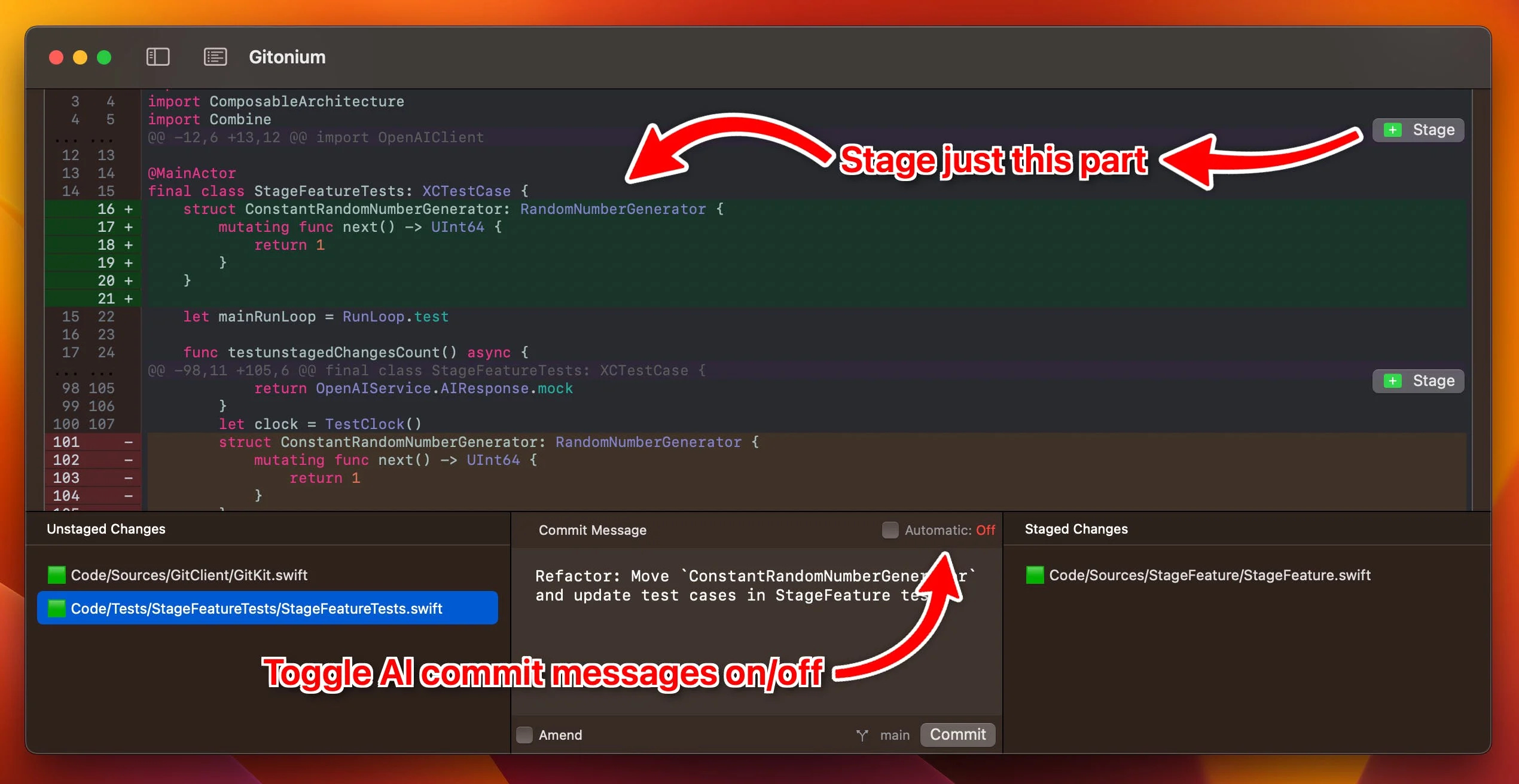 Finally, as I've been committing a lot lately, and as some of you had also commented, when You were staging multiple files, the AI would keep suggesting new commit messages all the time. This could be annoying, so I added a small toggle in the commit message view, which can be turned on and off. This way, You can compose your commits in peace, and when you're ready, You can turn it on and have the AI make a good commit message.