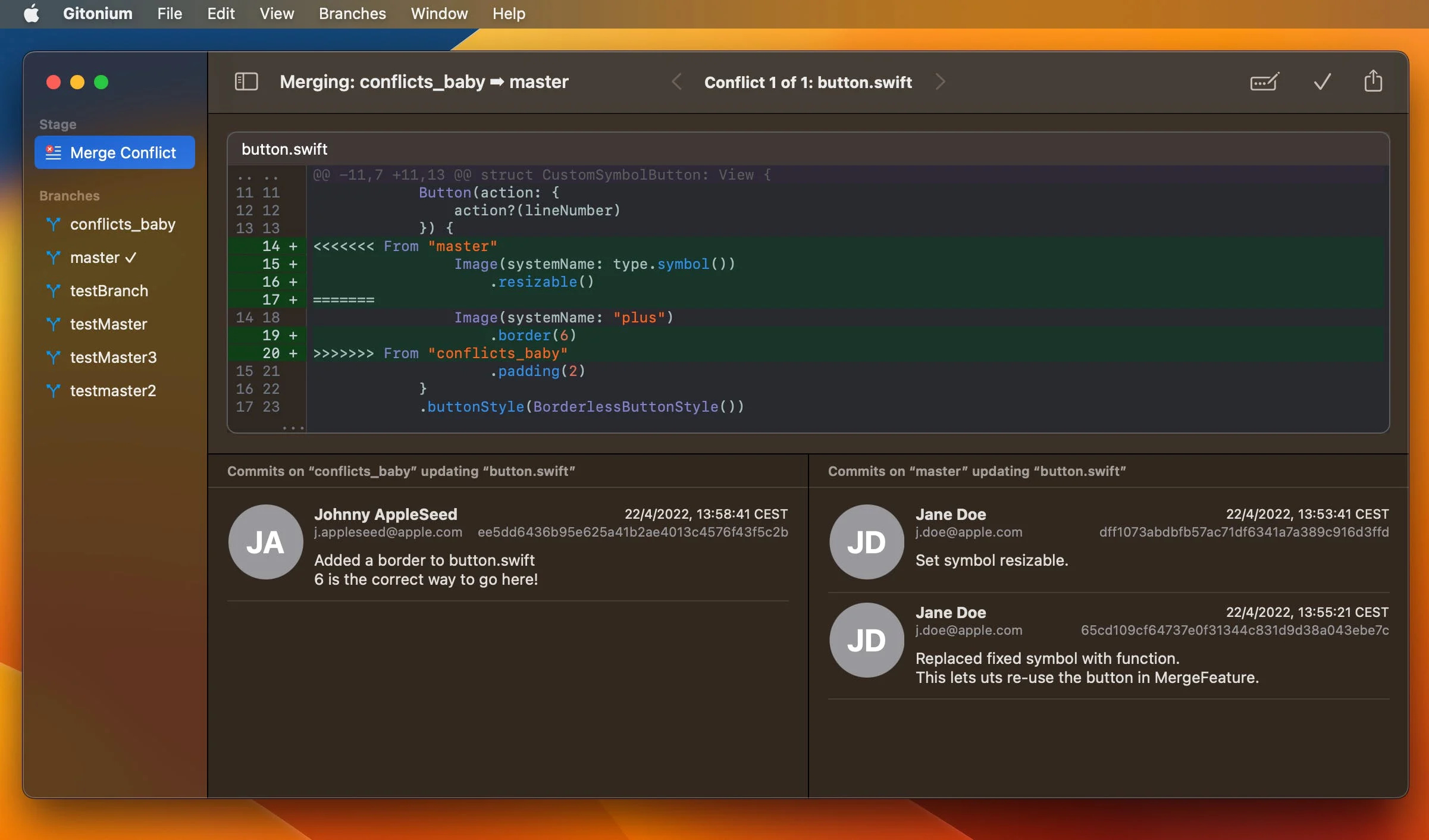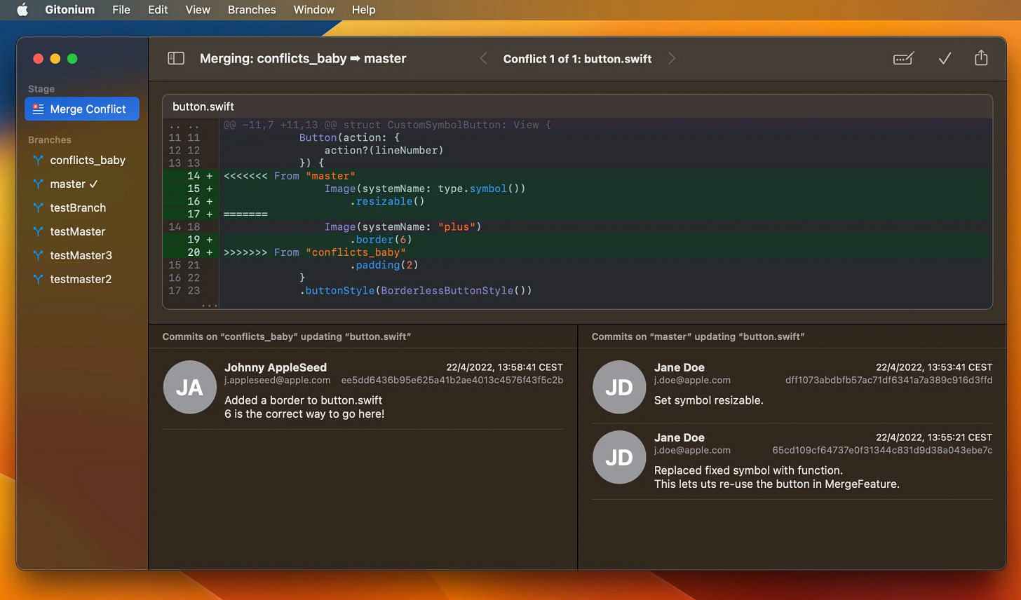 In this picture, you see my test repo during a merge conflict. As the header explains, we are in mid-merge of a branch called "conflicts_baby" going into "master," hence the arrow. In this example, we have a conflict in one file, "button.swift". (I know, ignore the lowercase "b" ๐.)